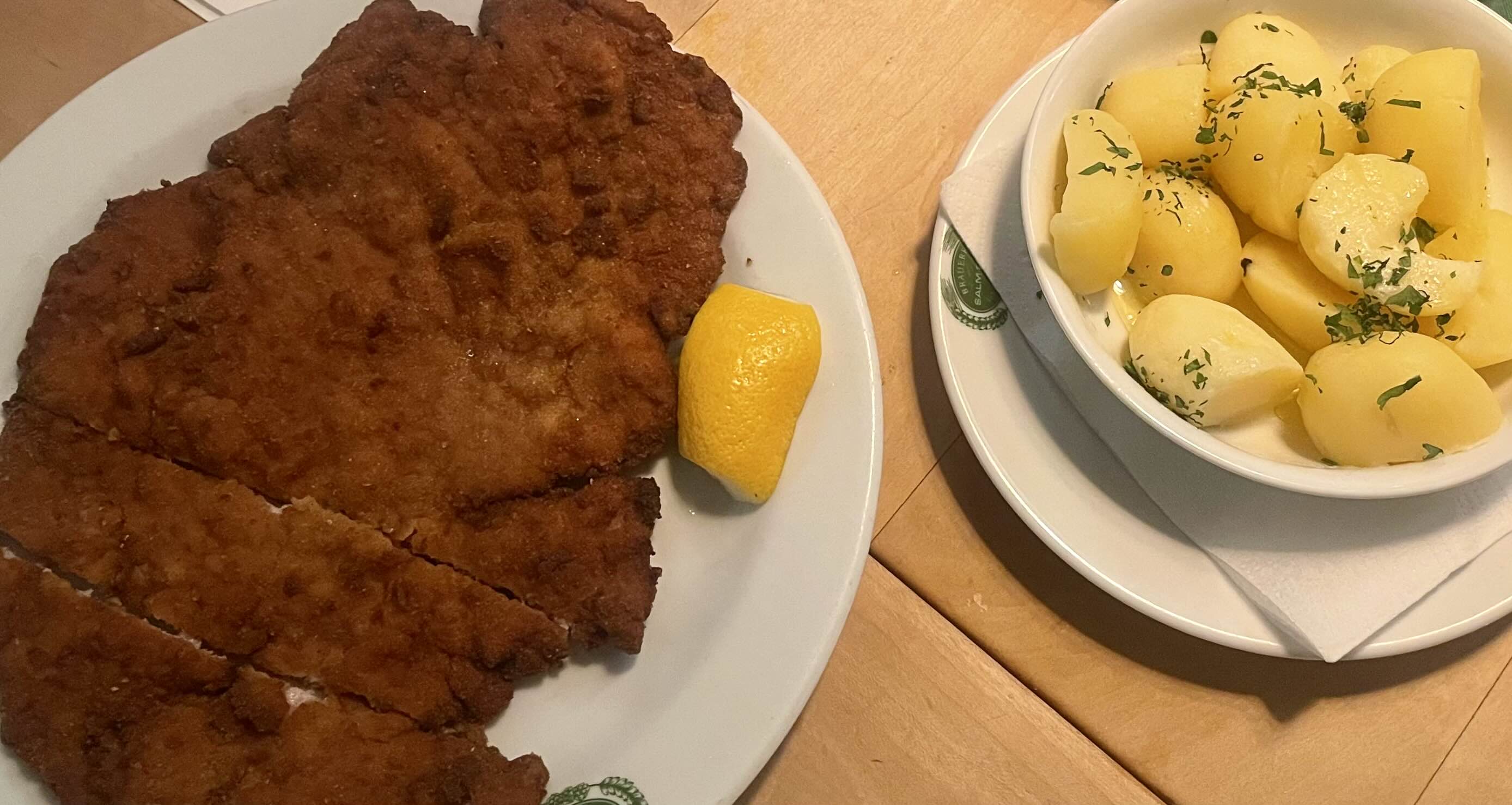 나름 요리를 좋아하는 내가 이번 오스트리아 방문에서 음식을 기대한 건 정해진 수순이었다. 5박 6일 일정이었지만, 학회 참석이 주목적이었기 때문에 정작 빈을 관광한 건 두 반나절이었다. 제한된 시간 내에 추천받은 여러 음식들을 다 섭렵하기는 애초부터 불가능했기에 나는 선택과 집중을 해야 했다. 사실 딱히 오스트리아 전통 음식이랄 것도 없는 것 같지만 그나마 대표적인 게 슈니첼이었다. 슈니첼은 소고기나 닭고기를 얇게 펴서 밀가루와 빵가루에 묻혀 바삭하게 튀긴 뒤 소금 간을 해서 짭쪼름하게 만든 놈이었다. 그냥 먹어도 간이 대충 맞았지만 정석은 소스에 찍어 먹는 것이었는데, 그 소스가 말이지 우리가 생각하는 돈까스 소스처럼 밀가루, 케첩, 버터, 설탕 등을 섞어 만든 갈색빛의 소스가 아니라 잼에 찍어 먹는 것이랬다. 나도 첫 슈니첼은 라즈베리 잼에 찍어먹었다. 첫 번째 사진에서 보이는 것처럼 나의 첫 슈니첼은 형편없게 튀긴 녀석이었는데, 맛도 형편없었다. 대실망, 급실망을 한 나머지 입가심으로 사이드로 나온 버터에 버무려 오븐에 구운 감자를 한입 먹었는데, 웬걸, 너무 맛있는 것이었다. 이거 슈니첼이 사이드이고 감자가 메인 아닌가, 싶은 생각이 절로 나는 순간이었다. 저 감자는 곧 집에서 만들어 볼 요량이다.