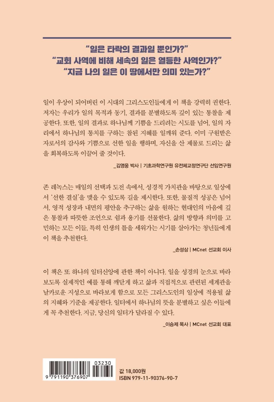 일이 우상이 되어버린 이 시대의 그리스도인들에게 이 책을 강력히 권한다. 저자는 우리가 일의 목적과 동기, 결과를 분별하도록 깊이 있는 통찰을 제 공한다. 또한, 일의 결과로 하나님께 기쁨을 드리려는 시도를 넘어, 일의 자 리에서 하나님의 통치를 구하는 참된 지혜를 일깨워 준다. 이미 구원받은 자로서의 감사와 기쁨으로 선한 일을 행하며, 자신을 산 제물로 드리는 삶 을 회복하도록 이끌어 줄 것이다.