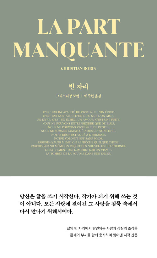 보뱅의 글을 읽고 있으면 보이지 않던 것들이 모습을 드러낸다. 어두운 곳에 가느다란 한 줄기 빛이 비칠 때야 비로소 드러나는 먼지처럼, 보뱅의 글은 평소에 모르고 지나치던 모든 존재들을 세밀하게 비춘다. 먼저 나를 멈추게 한다. 나도 모르는 사이에, 그러지 않기로, 그러지 말자고 연신 다짐해 놓고도, 또다시 쫓기듯 살던 나는 그제야 쫓기는 나 자신의 처지를 깨닫고 걸음을 멈추게 되고 주위를 둘러보기 시작한다. 시간도 멈추고 모든 것이 제자리에 놓인 응시의 시공간이 열리는 순간이다. 그곳에서 나는 경건한 자가 되어 다소곳한 자세로 내게 주어진 시간과 공간을 응시한다. 그리고 나를 포함하여 모든 존재들 가운데 공통적으로 존재하는 '부재' 혹은 '결핍'을 보게 된다. '빈 자리'다. 신이 떠난 자리일까, 그 텅 빈 시공간은 누구의 빈 자리인 걸까. 아무것도 아닌 듯하나 모든 존재의 중심에 놓인 이것, 이 공허를 인지하는 것, 이 빈 자리를 깨닫는 것이 보뱅의 글을 위한 독법이리라.