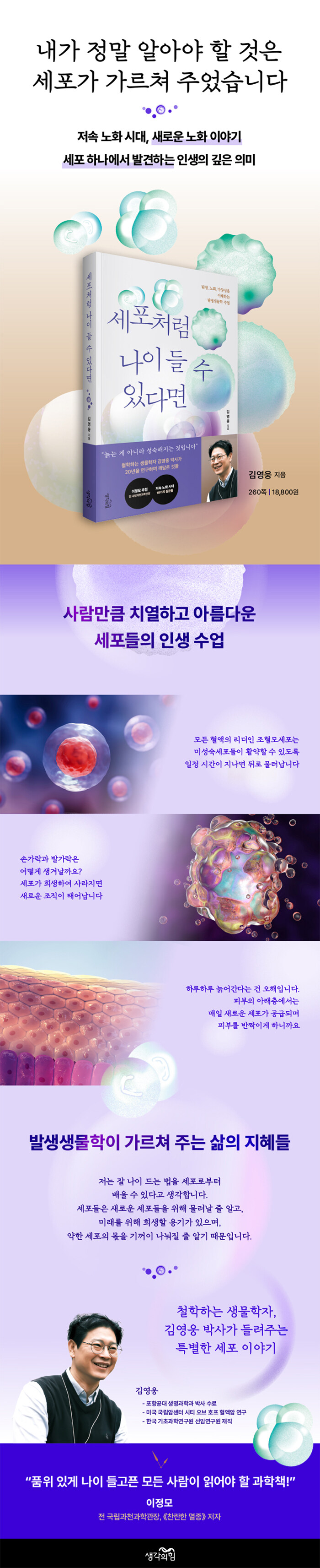 《세포처럼 나이 들 수 있다면》이 출간되었습니다. ‘탄생, 노화, 다양성을 이해하는 발생생물학‘이라는 부제를 달고 있는 과학대중서입니다. 교양 수준의 과학 지식이 담겨 있습니다. 중고등학생도 이해할 수 있도록 쉽게 썼습니다. 특히 역노화, 안티에이징, 저속노화가 유행인 시대에, 안 늙으려고 발버둥 치는 게 아니라 잘 나이 드는 법이 무엇인지 과학적으로 알아보고 철학적으로 사유해 보는 의미 있는 책입니다. 또한 여러 선천성 기형을 가지고 계신 우리의 이웃들을 발생생물학적으로 이해할 수 있는 내용도 담겨 있습니다. 덕분에 비로소 다양성이라는 아름다운 개념을 받아들이는 인식론적 개혁이 일어나게 될 수도 있을 거라 생각합니다.